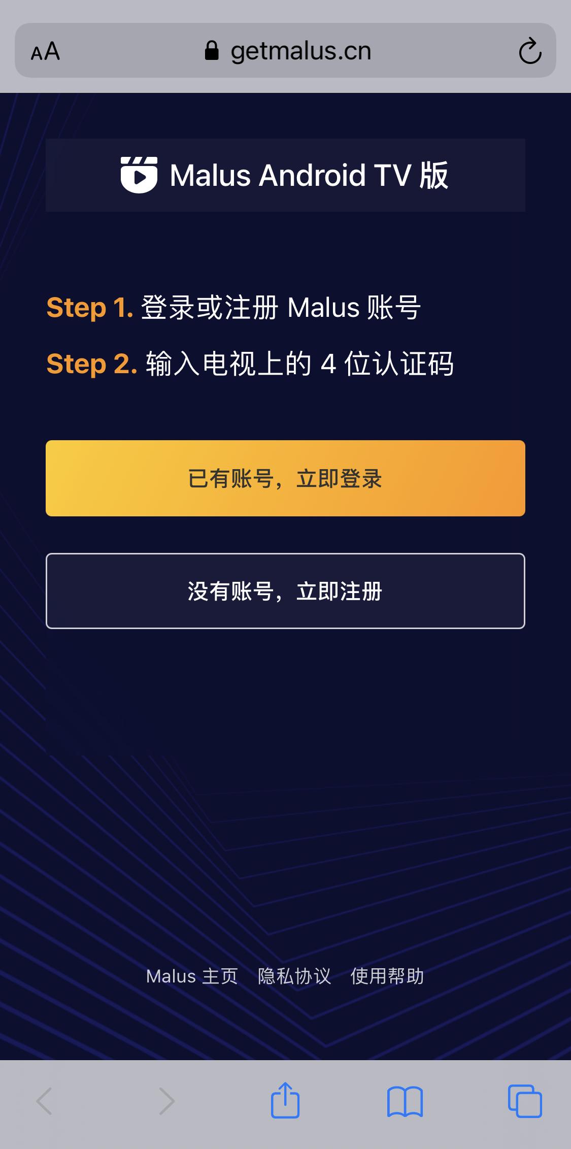方法3:如果设备上有内置浏览器,请用浏览器访问:https://getmalus.com/tv ,在网页内下载软件即可。